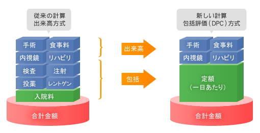 DPC(診断群分類別包括評価支払制度)とはDiagnosis Procedure Combinationの略で、従来の診療行為ごとに計算する「出来高払い」方式とは異なり、入院患者様の病名とその症状・治療行為をもとに厚生労働省が定めた1日当りの医療費が定額となる包括評価部分(投薬、注射、処置、入院料)と出来高評価部分(手術、麻酔、リハビリ、指導料)からなる新しい計算方式です。