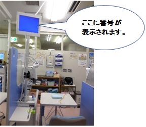- 採血の順番が近くなりましたら、中央採血室前の画面に番号が表示されますので中央採血室の中にお入りください。