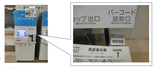 2.採血・採尿受付機に1階の再来受付機で発行された受診案内票の右上にあるバーコードを読み込ませてください。