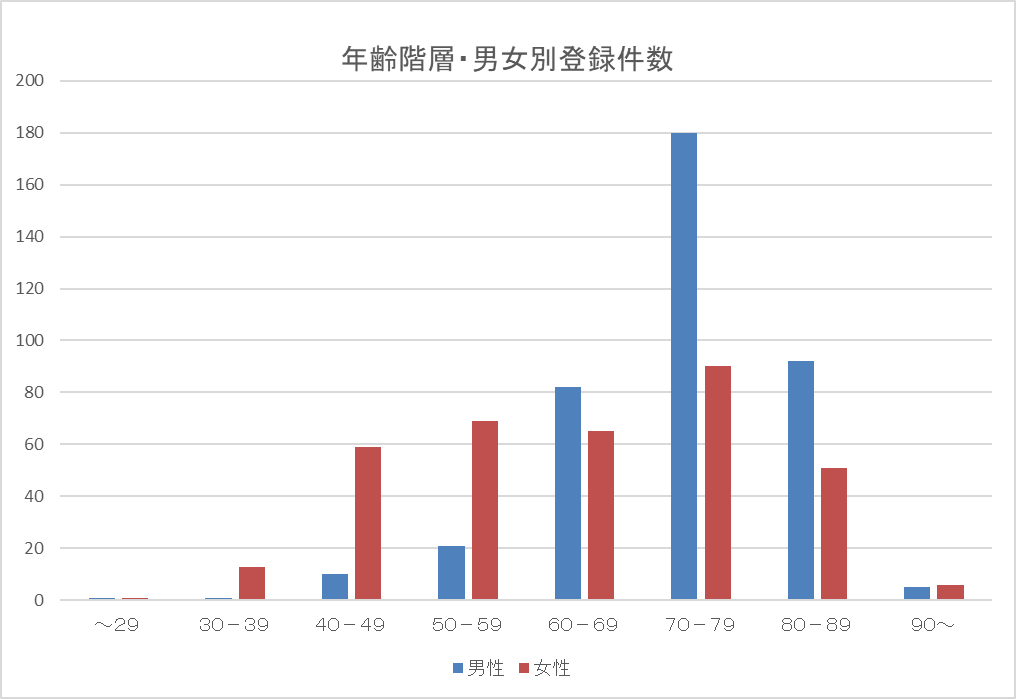 | 29歳以下 | 30-39歳 | 40-49歳 | 50-59歳 | 60-69歳 | 70-79歳 | 80-89歳 | 90歳以上 | 合計 | |