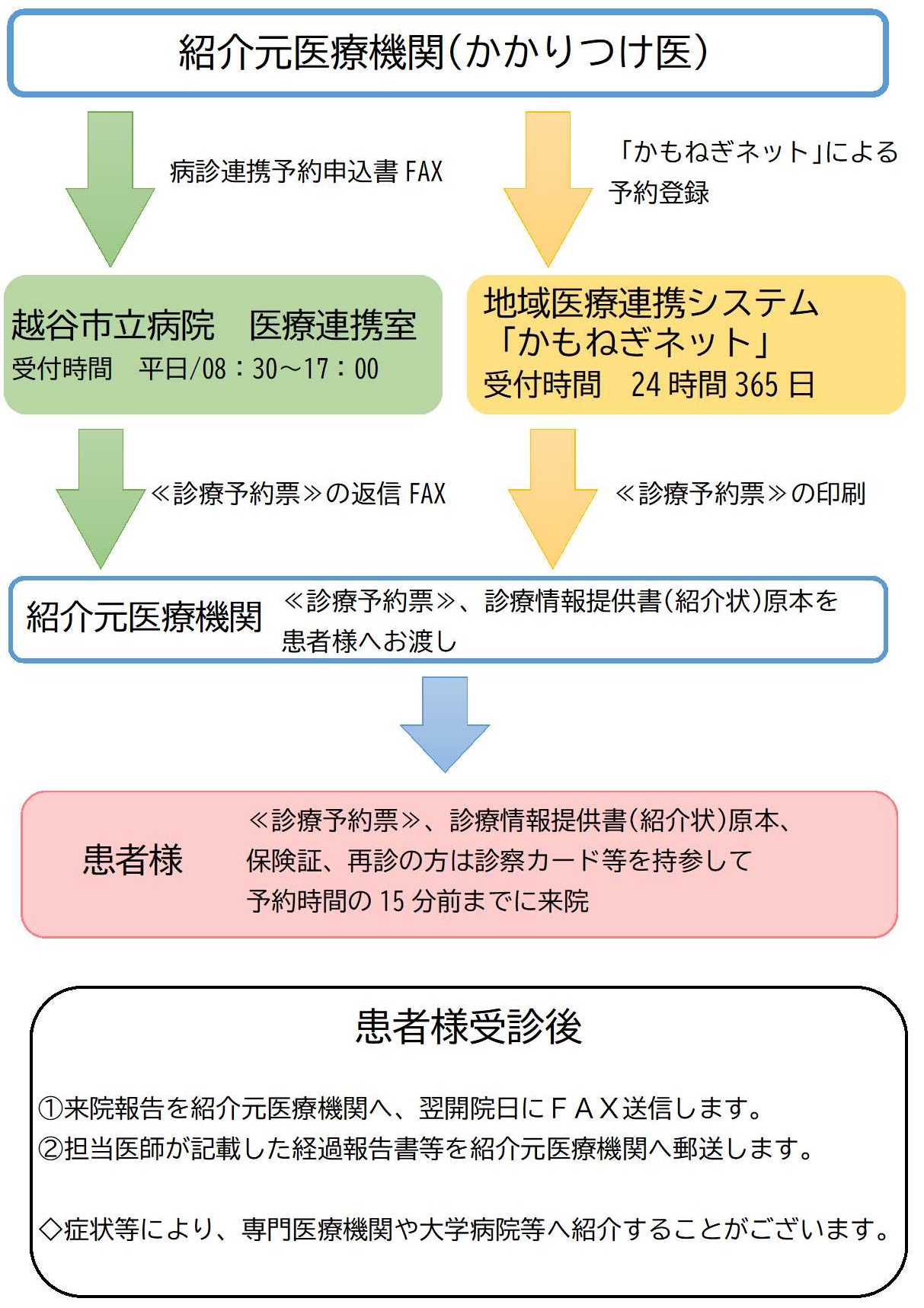 - 患者様に「越谷市立病院診療予約票(医療連携室から返信FAXしたもの)」と「診療情報提供書(紹介状)」をお渡しいただき、当日持参のうえ指定されている予約時間の15分前に来院いただくよう、お伝えください。